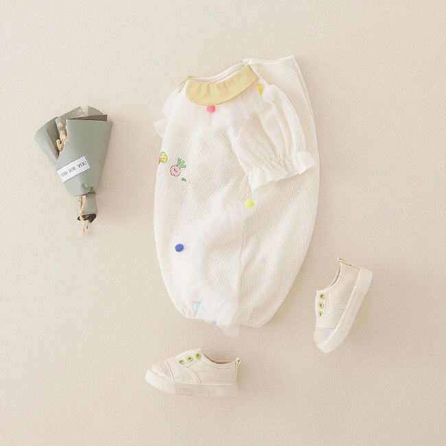 カラフルなドットと襟が可愛いロンパースです。 -size- 66cm:着丈42cm、胸囲26cm、袖丈13cm 73cm:着丈46cm、胸囲27.7cm、袖丈13.5cm 80cm:着丈50cm、胸囲29.4cm、袖丈14.2cm 90cm:着丈54cm、胸囲31cm、袖丈14.8cm -color- one color